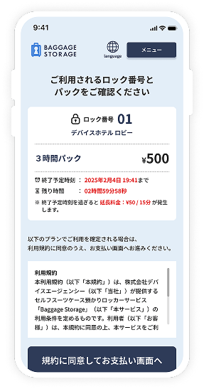 宿泊客は無料・一般客は有料など、ホテルの方針に合わせて柔軟に設定できます。たとえば、宿泊客専用の無料クーポンを発行し、「チェックイン前」や「チェックアウト後」の一定時間に限定して利用できるようにする、といった運用も可能です。 ※収益目的で導入される場合は「レベニューシェアプラン」でのご利用が必要となりますので、詳しくはお問い合わせください。
