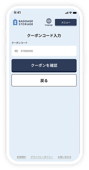 - 利用終了時は、宿泊客専用のクーポンコードを入力します。 ※サービスを有料化することも可能です。その場合は「レベニューシェアプラン」でのご利用が必要となります。