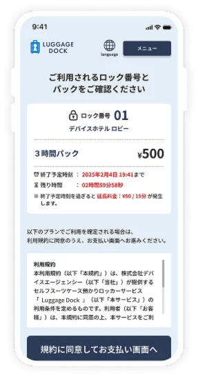 宿泊客は無料・一般客は有料など、ホテルの方針に合わせて柔軟に設定できます。たとえば、宿泊客専用の無料クーポンを発行し、「チェックイン前」や「チェックアウト後」の一定時間に限定して利用できるようにする、といった運用も可能です。 ※収益目的で導入される場合は「レベニューシェアプラン」でのご利用が必要となりますので、詳しくはお問い合わせください。