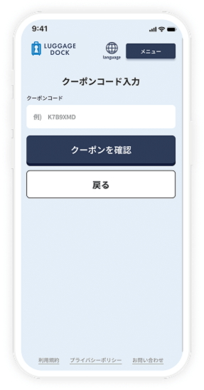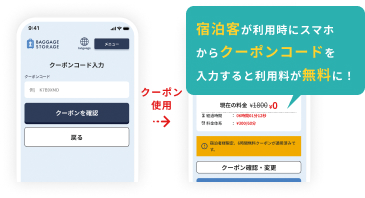 - 利用終了時は、宿泊客専用のクーポンコードを入力します。 ※サービスを有料化することも可能です。その場合は「レベニューシェアプラン」でのご利用が必要となります。
